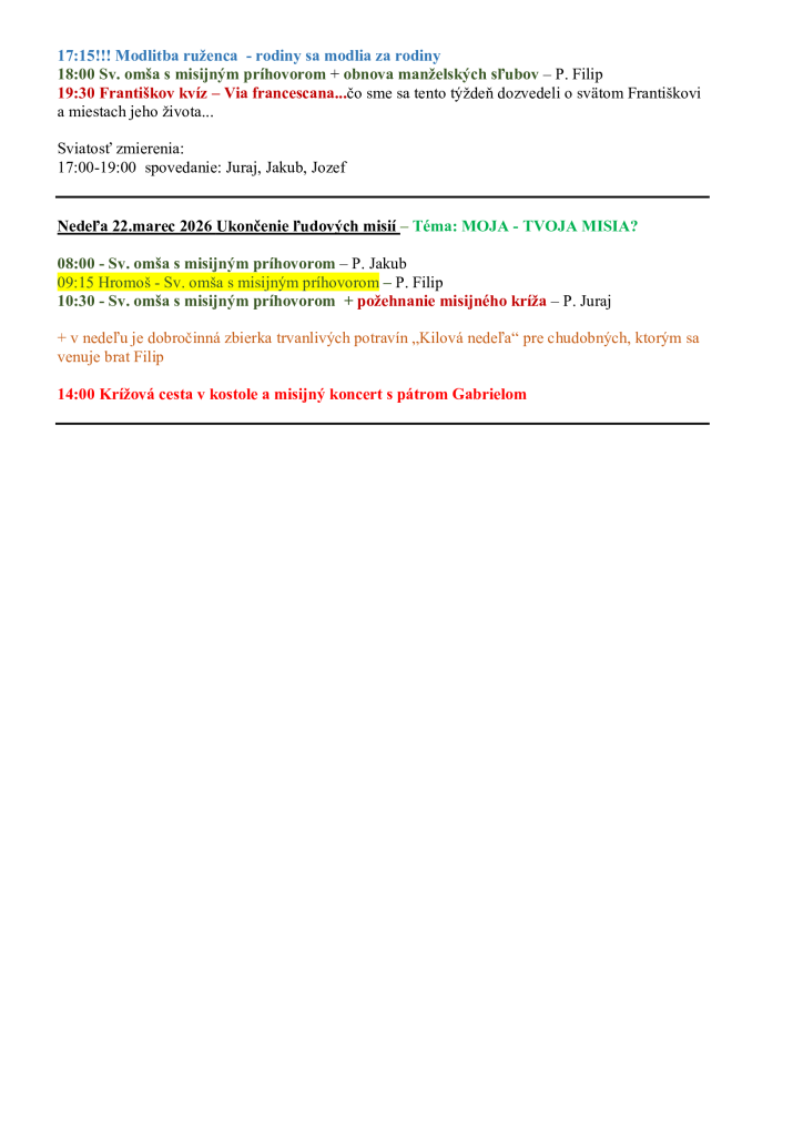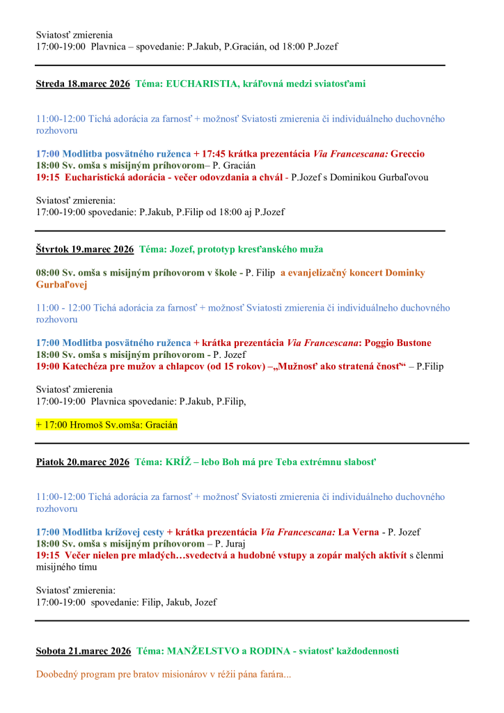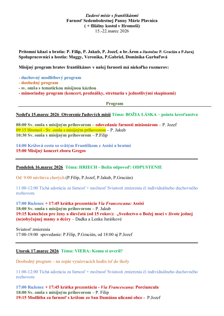 Od 15. do 22. marca budú v našej farnosti ľudové misie, ktoré budú viesť františkáni. Program na jednotlivé dni nájdete nižšie: